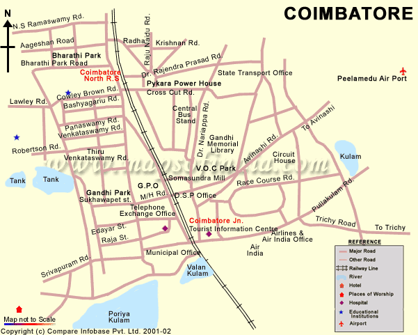 Coimbatore is the third largest city of Tamil Nadu and is known as the Manchester of South India. The city covers a total area of about 254 square km and has a number of tourist destinations making it a perfect place for enjoying holidays. It is a multi cultural city with temples, Gurudwaras and mosques and attracts large number of tourists each year by its beauty. The city has a good transportation network with three National Highways passing through the city. Moreover, the city is easily accessible by air, road and rail and has a number of tourist destinations. To cater the accommodation and dining needs of the tourists the city has a large number of hotels and lodges which offers a satisfactory stay in the city. We at Toursitplacesinindia.com provide you with complete Coimbatore Maps. These Maps of Coimbatore would definitely assist you to plan a tour in this beautiful city of Coimbatore.
