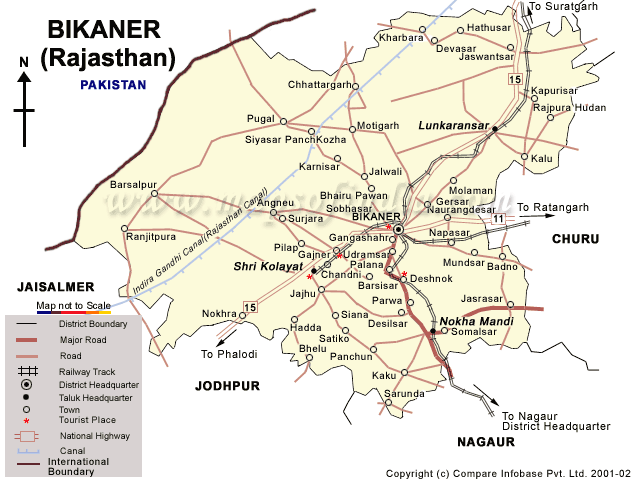 Bikaner is a beautiful "Desert City" of Rajasthan, which draws large number of tourist every year for its picturesque sand dunes, red sandstone forts, Havelis and camel safaris. The city is well connected with other parts of India by air, rail and roads. Since it is a desert city, it is advisable to visit the city during the winters. We at Touristplacesinindia.com give you complete Bikaner Maps so that you can plan your tour to this beautiful city. These maps of Bikaner will give you complete guidelines about the city. |