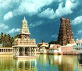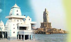 Kanyakumari Temple - A Shakti Peetha (place of worship where the pieces of Goddess Durga�s body fell during the Tandav), this temple is dedicated to Parvati, a virgin incarnation of Goddess Durga who wanted to marry Lord Shiva. Devi Kanya Kumari or Kumari Amman is the principal temple deity. According to legends, Shiva did not turn up on the wedding day as promised and the feast remained incomplete with grains turning to stones. The temple has the black stone image of the virgin deity with a diamond nose ring glittering in the dark chambers.